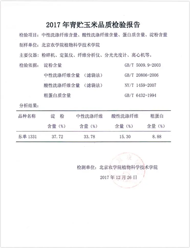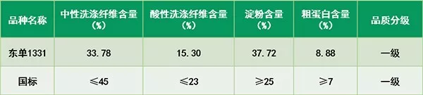 東單1331用于青貯產業,糧飼通用品質好,淀粉含量高達37.72,纖維、粗蛋白等含量合理。全株青貯,有65%的營養來自于籽粒,10%來自于細胞內含物,25%來自于消化纖維。青貯果穗一樣大,既能收草,也能收籽粒,是糧飼通用的大品種。